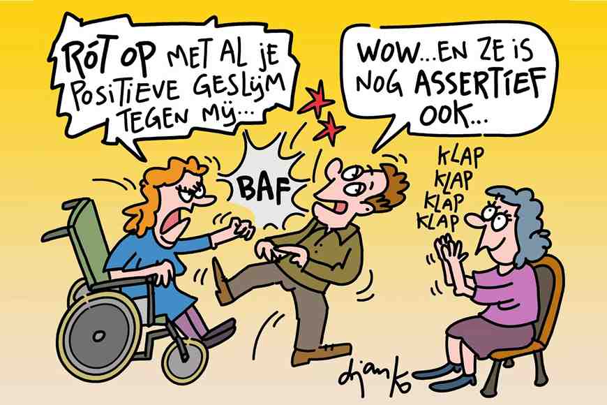 Meestal is er geen opzet in het spel. Veel mensen hebben volgens mij geen idee wat ze zeggen en doen. Het zegt veel over hun onwetendheid, maar gunstig is het voor niemand. Niet voor henzelf omdat ze het zo nodig hebben vooral de beperking te zien in plaats van de mens, niet voor de gehandicapte mens die als mens gezien wil worden, niet als object.